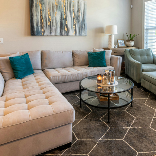 A mesa de centro deve ser proporcional ao sofá e ao restante dos móveis. Em geral, ela deve ter de 50% a 75% do comprimento do sofá e a altura deve ser próxima à do assento, garantindo conforto e acessibilidade.